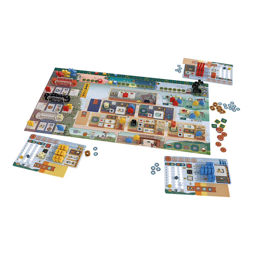 El tablero central muestra el castillo de Himeji en todo su esplendor, dividido en varias zonas. La más grande es el interior del castillo, con la habitación de las mil alfombras, donde los cortesanos deberán ir ascendiendo socialmente hasta llegar al círculo más cercano al Daimio para gozar de su favor. También hay el estanque y los jardines, cuidados pacientemente por los jardineros donde todo el mundo puede relajarse y contemplar su belleza sin restricciones. Otra zona importante es la muralla y el exterior del castillo, donde los guerreros patrullan y montan guardia. Finalmente, encontramos la zona de los tres puentes, donde se acumulan los tres tipos de dados que podrán usarse para llevar a cabo acciones, y el dominio personal de cada jugador, donde llevarán las cuentas de sus recursos y donde tendrán la reserva de trabajadores.