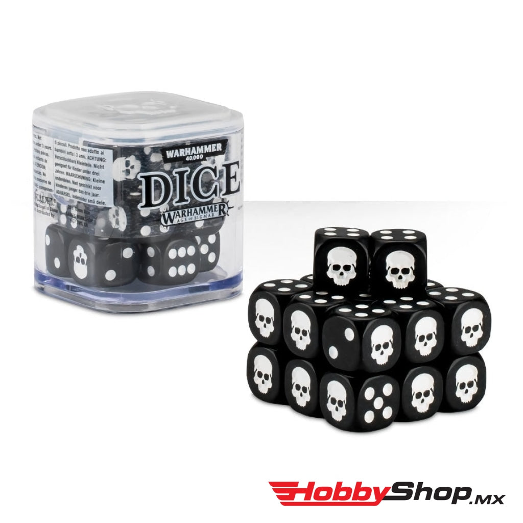 Un cubo de plástico resistente que contiene dados negros de 12mm con íconos de calaveras en lugar del 1, este cubo de dados cuenta con una tapa de calavera en relieve (después de todo, nunca se pueden tener demasiadas calaveras) y es apilable.