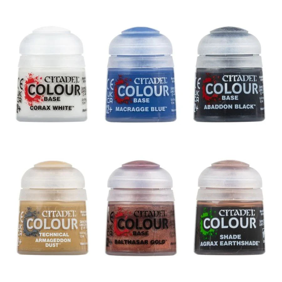 Las seis pinturas de Citadel Colour vienen en botes de 12 ml y traen los colores esenciales para pintar las miniaturas de Ultramarines así como pinturas Technical para crear textura en las peanas: