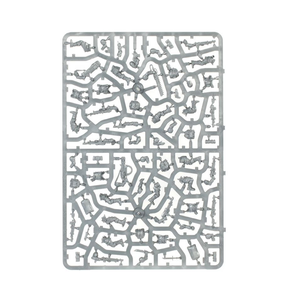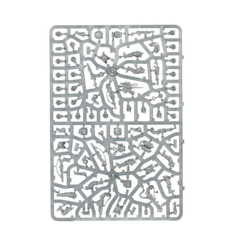 Con este kit de plástico multicomponente puedes montar 10 Tropas de Choque de Cadia, el núcleo de muchos regimientos del Astra Militarum. Cada Soldado de Choque está armado con granadas de fragmentación y un rifle láser, dirigido por un Sargento armado con un rifle automático alimentado por tambor o una espada sierra con una pistola láser o bólter. El kit también incluye una variedad de armas especiales para equipar a tus Soldados de Choque: un lanzallamas, un lanzagranadas, una pistola de fusión y una pistola de plasma, así como un vocotransmisor para las comunicaciones en el campo de batalla.