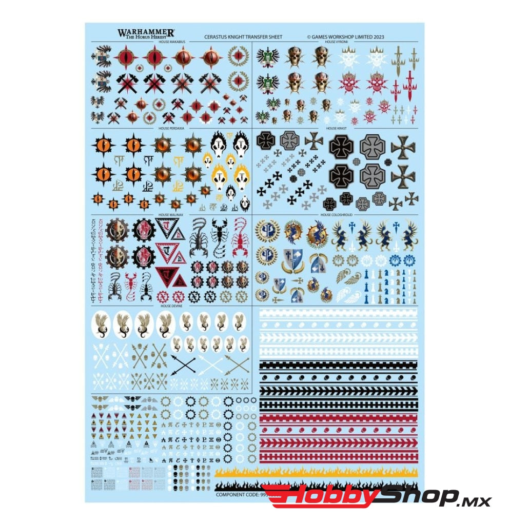 Esta caja consta de 208 piezas de plástico e incluye una peana Citadel ovalada de 170x109mm. También incluye una hoja de calcomanías de Cerastus Knight de la Era de las Tinieblas con 517 marcas e iconos opcionales para las Knight Houses de la Herejía de Horus. Esta miniatura se suministra sin pintar y requiere montaje. Recomendamos utilizar pegamento para plástico Citadel y pinturas Citadel.