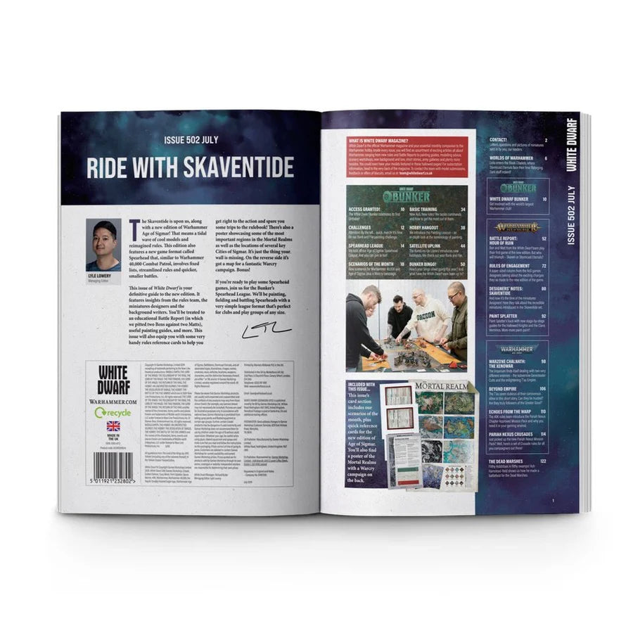 Cada copia del número 502 también viene con un inserto de cartón, que incluye 2x tarjetas de recetas de pintura, 2x tarjetas de logros de búnker, 3x tarjetas de referencia rápida de doble cara para la nueva edición de Warhammer Age of Sigmar, un póster de doble cara tamaño A2 que muestra los Reinos Mortales en un lado con una campaña de Warcry en el reverso, y 1x tarjeta de doble cara que incluye el escenario del mes para Warhammer 40,000 y Warhammer Age of Sigmar.
