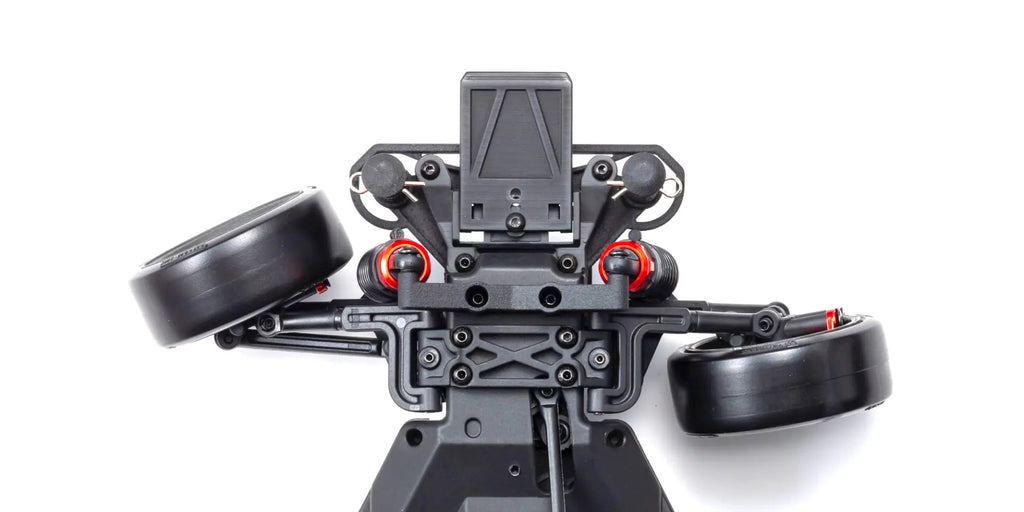 El chasis de drift de Kyosho, cuidadosamente diseñado, ofrece una capacidad de ajuste y un rendimiento inigualables. El chasis principal de resina está dividido en secciones delantera y trasera, lo que permite modificar la distancia entre ejes de 240mm a 274mm. Esta adaptabilidad garantiza la compatibilidad con diversos tipos de carrocería. La unidad de tracción trasera cuenta con un eje de carrete rígido sin diferencial, lo que mejora la suavidad del drifting. Los ajustes de la suspensión, como el ángulo de avance y el centro de balanceo, permiten a los usuarios ajustar el manejo a sus preferencias.