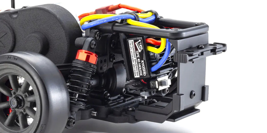 El Fazer D2 viene equipado con electrónica de vanguardia que optimiza su rendimiento en drifting. Un receptor KRG-331D meticulosamente diseñado con una unidad giroscópica integrada garantiza un control preciso de la dirección y el acelerador, permitiendo un drifting sin esfuerzo. El ESC Kyosho Speed House de 60 A ofrece tres modos de conducción: avance, freno y marcha atrás. El servomotor KS4072-06W de alto rendimiento trabaja en armonía con el giroscopio para un control óptimo del contravolante. Completa el conjunto un potente motor G22 540 con escobillas, montado para optimizar la distribución del peso y mejorar la estabilidad.