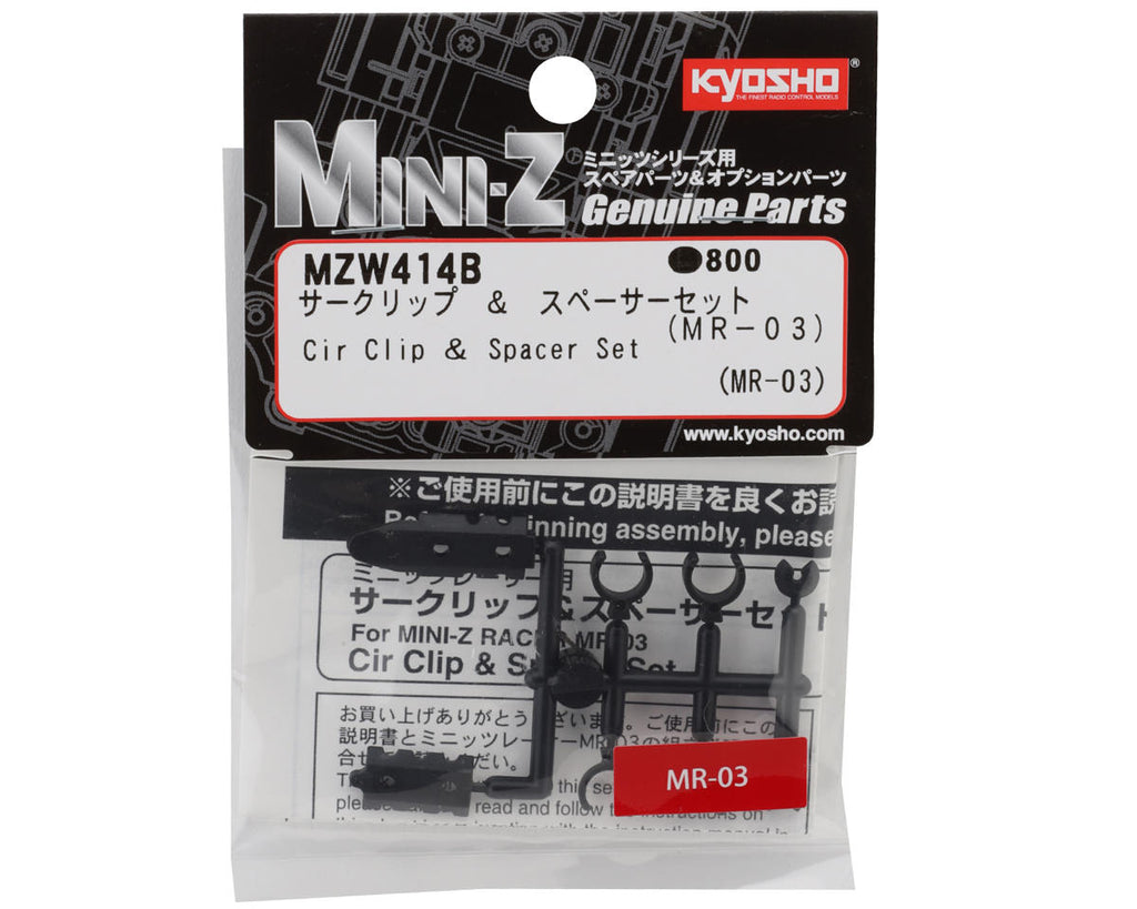Este es un conjunto de espaciador y clip circular de Kyosho de reemplazo, y está diseñado para usarse con el Kyosho Mini-Z MR-03. Este paquete incluye los clips de seguridad del perno rey delantero, el espaciador de la placa en T de la suspensión trasera y el espaciador del resorte del amortiguador trasero.