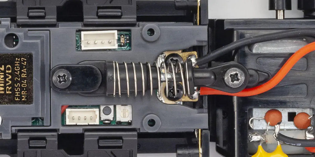 El MR-04 incorpora manguetas delanteras actualizadas con pivotes de dirección integrados que reducen la fricción, lo que permite una dirección más precisa y controlada. Los rodamientos de bolas mejorados minimizan la resistencia rotacional, proporcionando un funcionamiento más suave y eficiente. La suspensión trasera está equipada con un amortiguador de muelles helicoidales para absorber los impactos de la pista, con la opción de actualizarlo a un amortiguador de aceite para una mayor estabilidad en superficies difíciles.