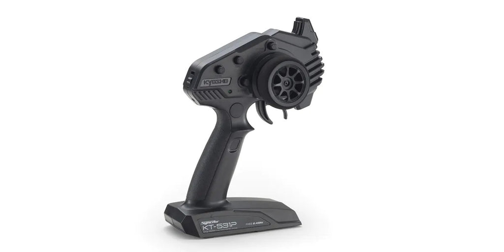 Incluye un elegante diseño del transmisor Syncro KT-531P. Cuenta con control de dirección y aceleración, así como ajuste de velocidad dual del ángulo de dirección y control de la velocidad de parpadeo de los LED opcionales. Además, el transmisor tiene una función de modo de entrenamiento que limita la velocidad del automóvil para facilitar el aprendizaje (la configuración predeterminada en el momento del envío es el modo de entrenamiento).