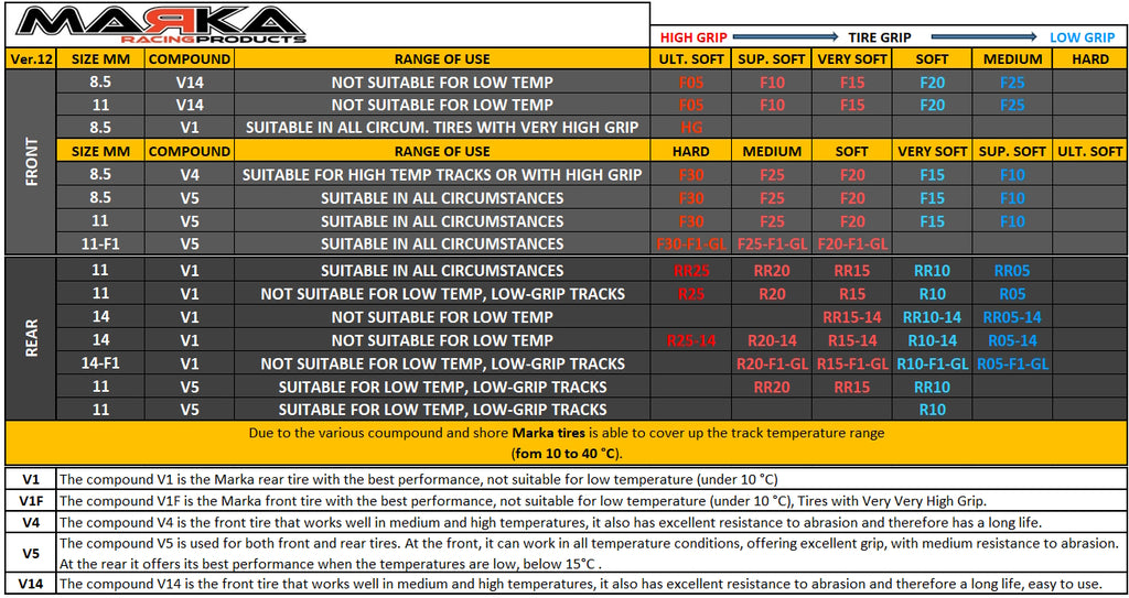 Los neumáticos Marka Racing tienen un rendimiento degradado menor que otros neumáticos del mercado actual, lo que garantiza un rendimiento estable en cada carrera. El compuesto del material garantiza la homogeneidad entre los diferentes lotes producidos en diferentes momentos.