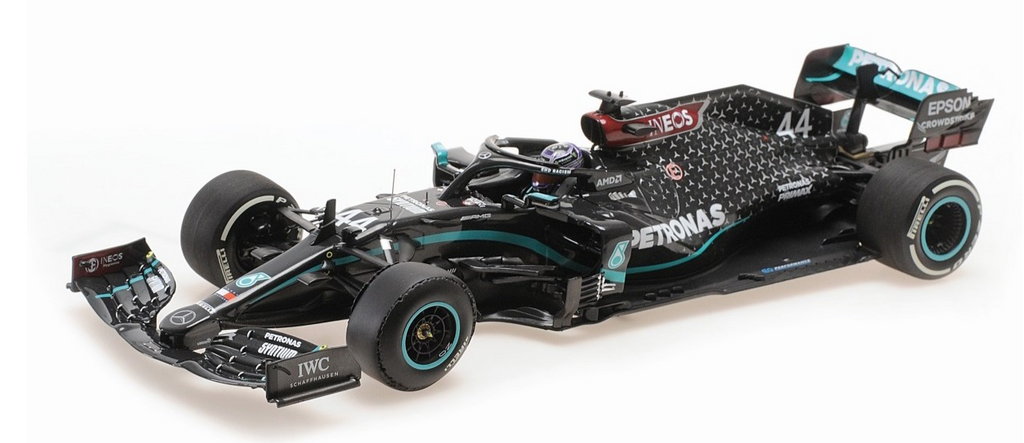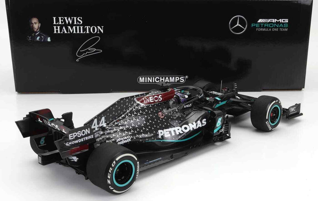 Minichamps - Mercedes-AMG Petronas F1 Team W11 EQ Performance – Lewis Hamilton – Winner British GP 2020 Flat Tyre, escala 1:18