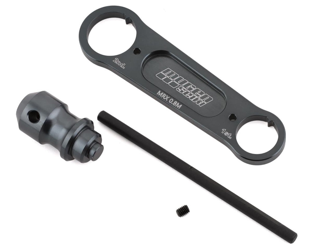Herramienta Mugen Seiki Pinion Gear. Esta herramienta de engranajes de piñón es una excelente opción para facilitar el mantenimiento. Diseñado para trabajar con engranajes Mod 0.8, el uso de esta herramienta le permitirá sujetar el piñón del engranaje primero o segundo y apretarlo. El paquete incluye una herramienta de engranajes y un candado de campana de embrague.