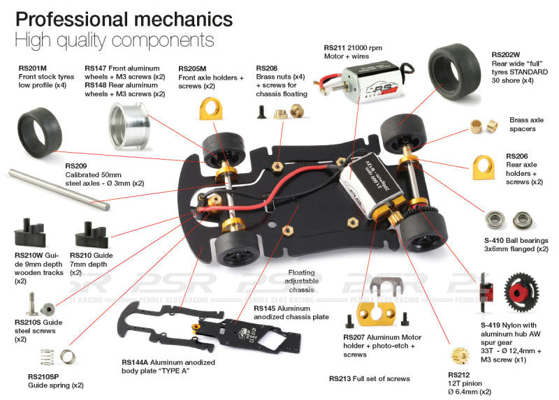 - Ruedas delanteras y traseras de aluminio con tornillos M3