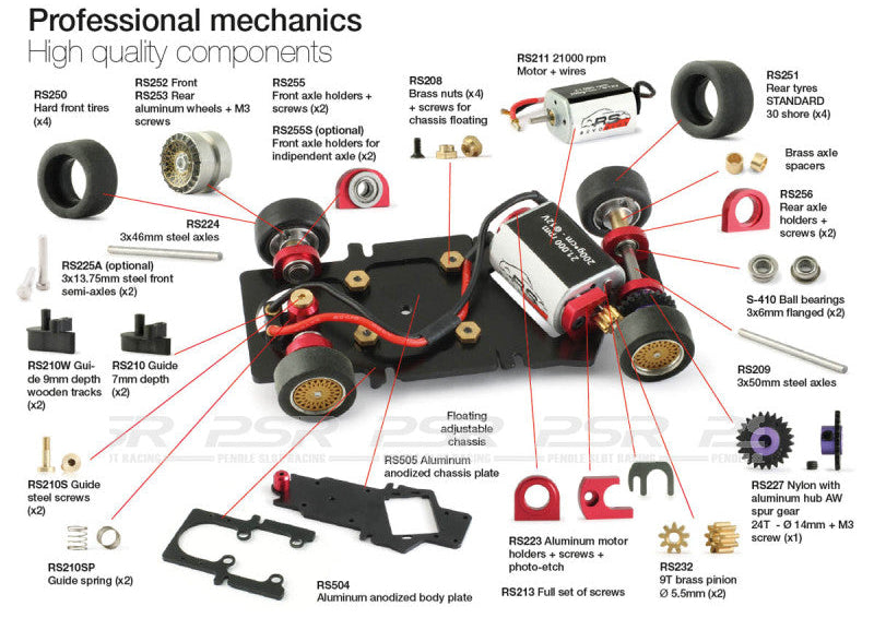 - Ruedas delanteras y traseras de aluminio con tornillos M3
