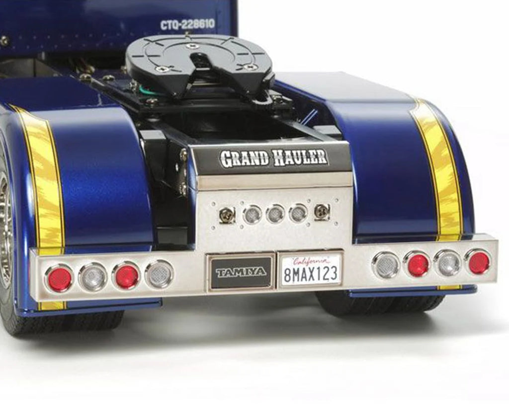 El kit semirremolque Grand Hauler de Tamiya a escala 1/14 reproduce un vehículo real, un enorme camión cuadrado personalizado como los que se ven en Norteamérica. El chasis de escalera del modelo cuenta con canales laterales de aluminio con travesaños de resina y está equipado con una suspensión de gran realismo con ballestas metálicas y amortiguadores de fricción. Un motor frontal y una transmisión de 3 velocidades impulsan los dos ejes traseros, equipados con diferenciales integrados para una conducción suave en curvas. Un sistema de radiocontrol de 4 canales y una unidad multifunción te permiten conducir el vehículo y experimentar luces, sonidos y vibraciones realistas.