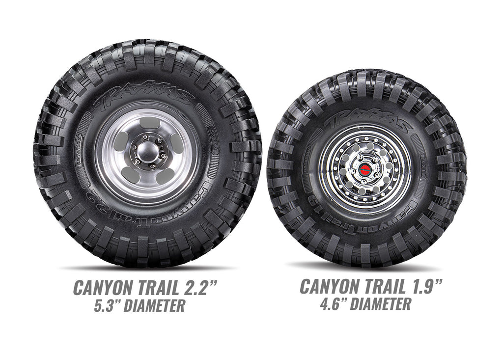 - Ruedas y neumáticos sobredimensionados: Los agresivos neumáticos Canyon Trail cuentan con tacos grandes para un mayor agarre e insertos de espuma para un rendimiento realista en senderos. Las ruedas Mag cromadas ranuradas vienen con bujes de bloqueo de réplica para ocultar las tuercas de las ruedas.