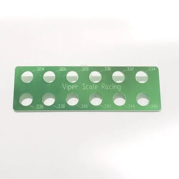 Presentamos el medidor de neumáticos compacto Viper Scale Racing. Este medidor es del tamaño perfecto para caber en tu caja de pit HO. Mide tus neumáticos delanteros/tratras de .324 a .346″ en incrementos de .002″.