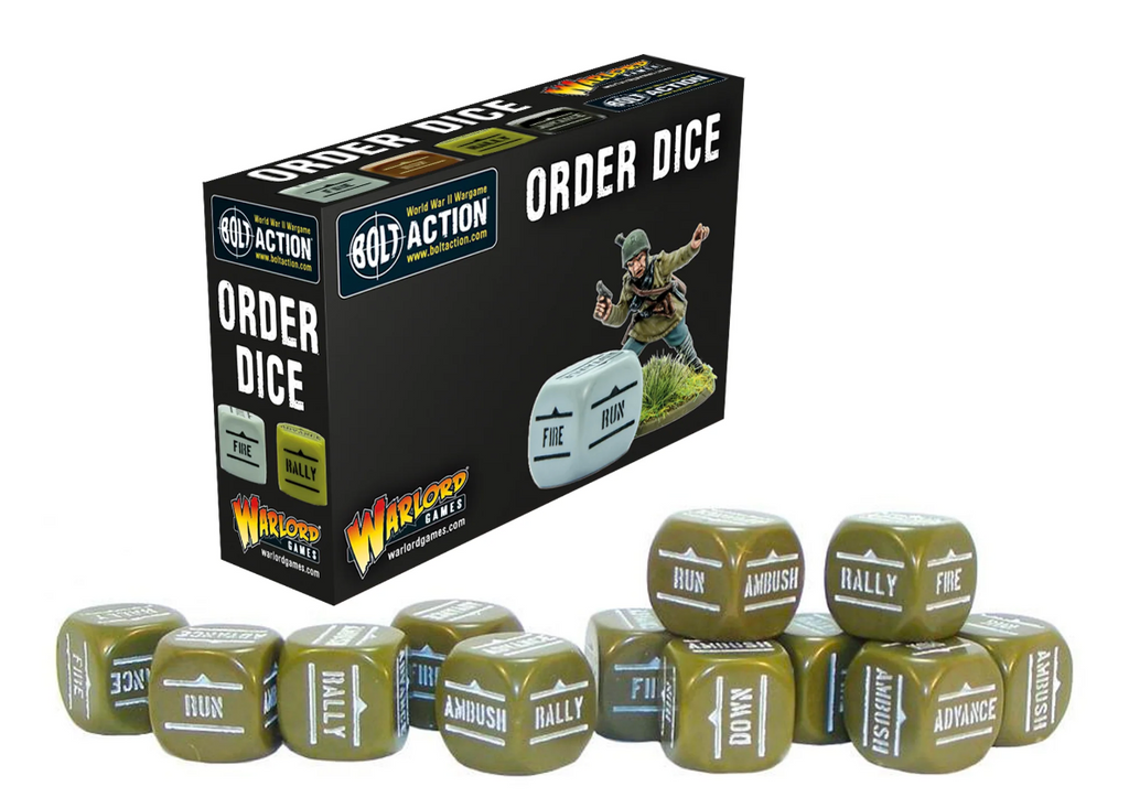 Bolt Action utiliza un sistema de activación aleatoria de unidades mediante datos de órdenes. Cada jugador necesitará un conjunto de dados de órdenes de un color diferente al de su oponente.